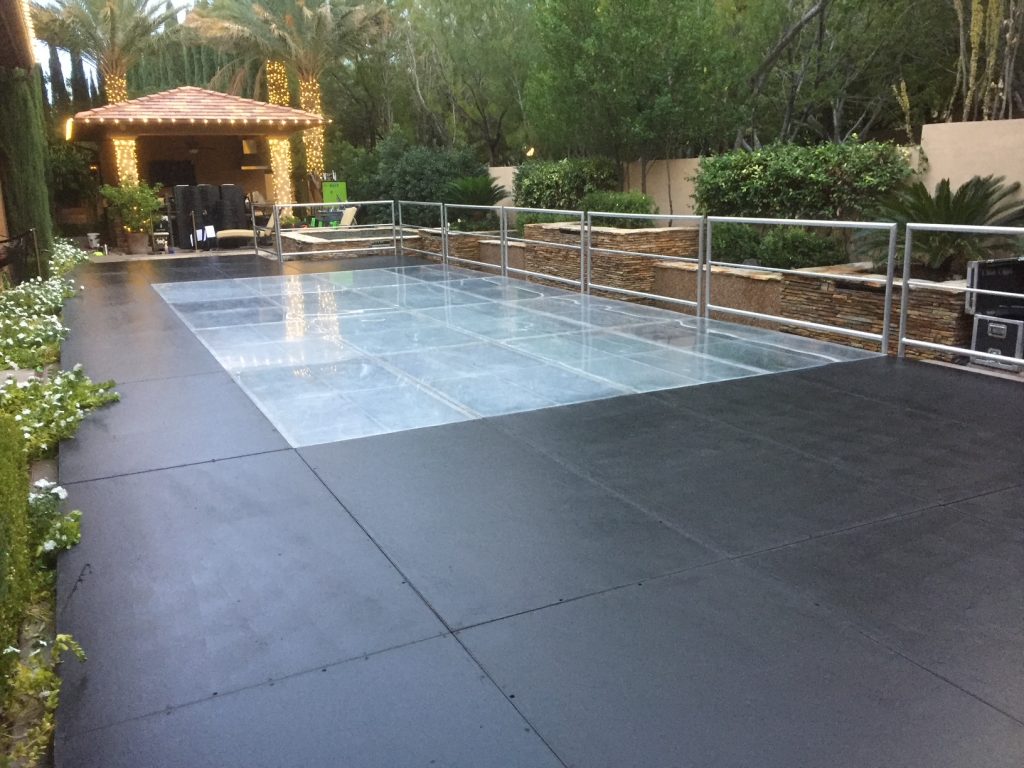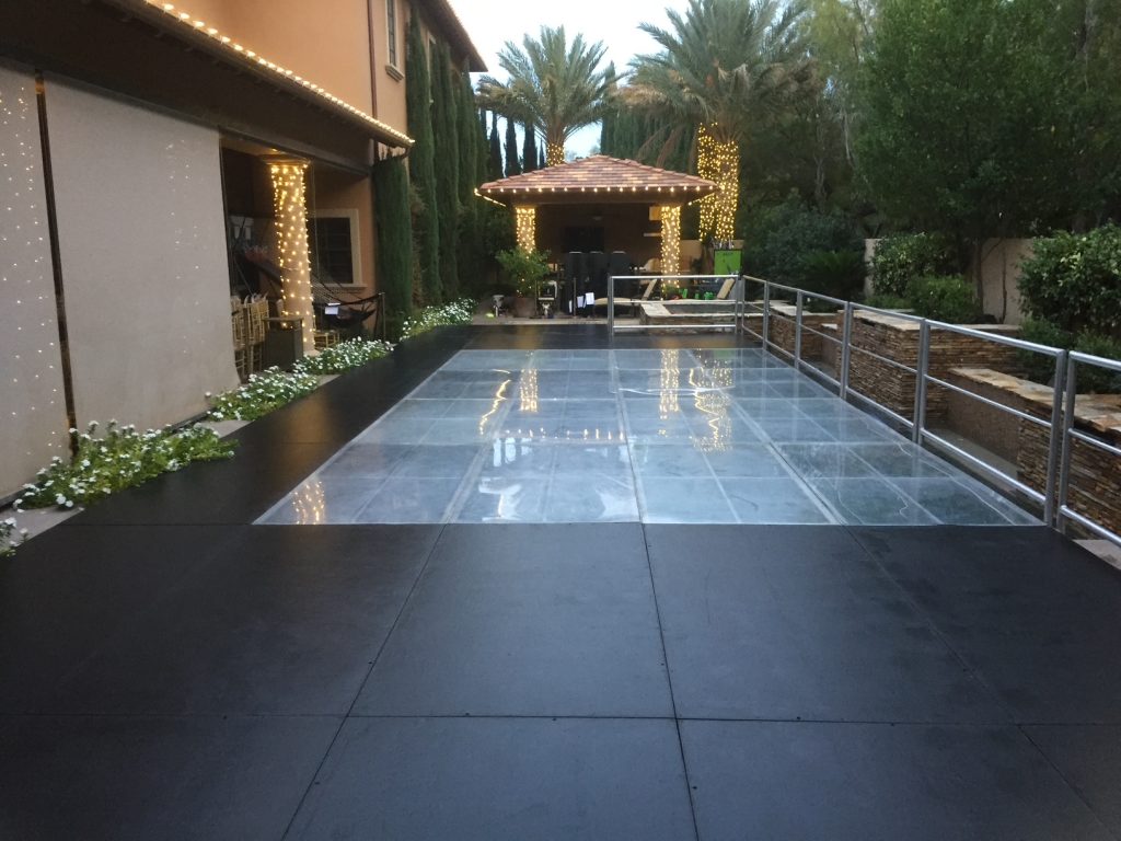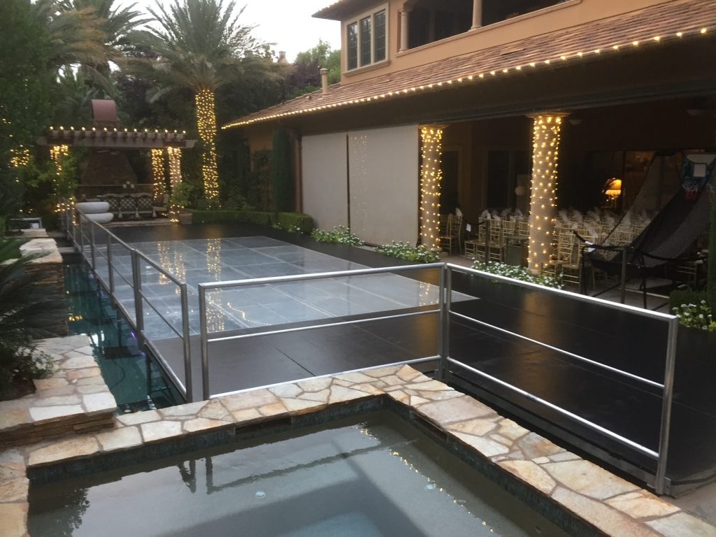 Las Vegas, Nevada – This pool cover housed the location for a wedding reception dinner along with the dancefloor for the dancing that took place into the we-hours of the night. The pool design shape was an irregular shaped pool with a raised wall where the spa was located. To avoid any open exposed areas into the water, Stage Commander divers had to design and build around those obstructions so that nobody could fall into the pool between the cover and any of the raised walls. Also, they had to build over a raised step section on the right side of the pool so that the entire pool cover elevation was the same level. The client also added our in-water LED lighting system to illuminate the plexiglass portion of the pool cover.
