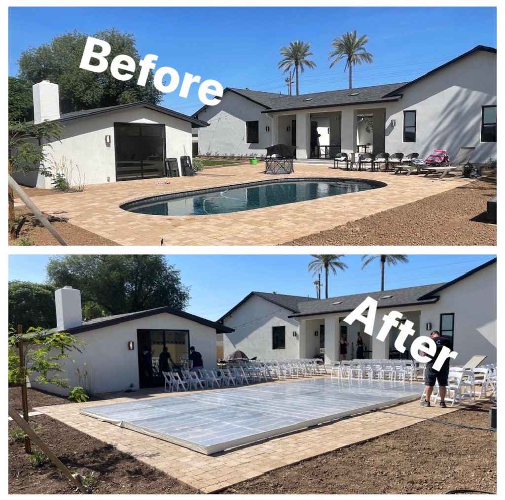 In the sunshine state between all the recent wonderful weather they have been having in the Phoenix valley, a long enough break between storms made way to host a wedding in a backyard at a nice residential house. Out of all the various flooring options Stage Commander offers, the client selected all plexiglass with our in water LED water package. This dance floor over the pool was used for both the wedding ceremony and the dance floor. Below is a before and after picture of the finish product.
