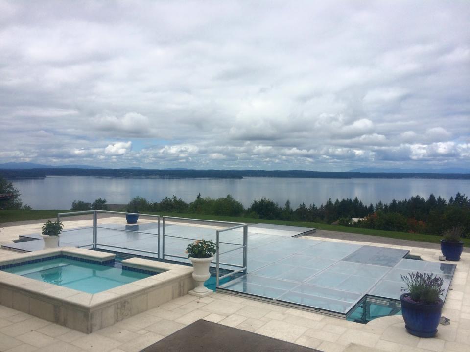 Below are photos of a wedding ceremony in Washington state. This pool cover was called upon for a double use production piece of the event. It first was used to house the wedding ceremony and after the ceremony was concluded, the chairs were removed and prepped for the open dancing leg of the reception. The pictures below also display a great representation of before & after.