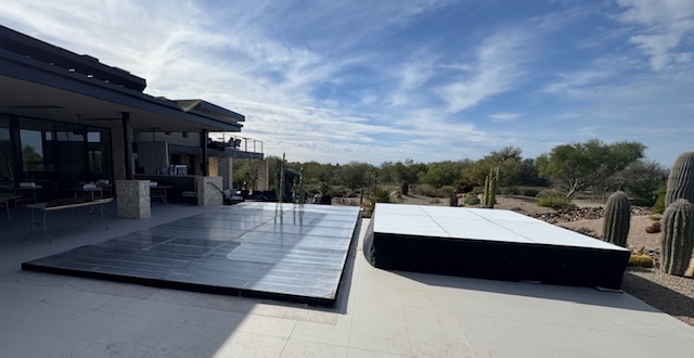For this blog post, we decided to highlight the one that took place in Scottsdale, Arizona. This dance floor was built over a standard size/shaped pool at a home in a luxurious neighborhood. The client not only selected our plexiglass surface option but also added our in-water, water fixture package. In addition to that, they added an all clear on ground stage to house the band during their rocking performance. Stage Commander prides in being the nations #1 temporary pool cover building company for special events. There isn’t another company out there that can execute a precise operational execution from start to finish like we can. If you are interested in a possible pool cover for your special event, please fill out our contact form and let us begin to show you how we do it.