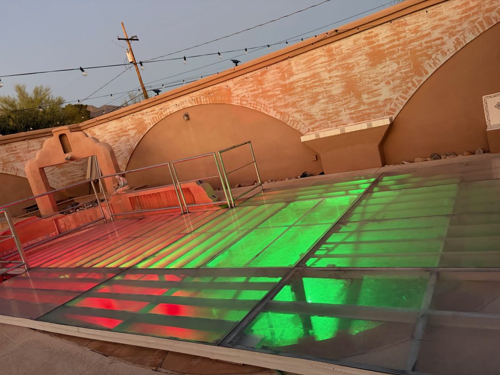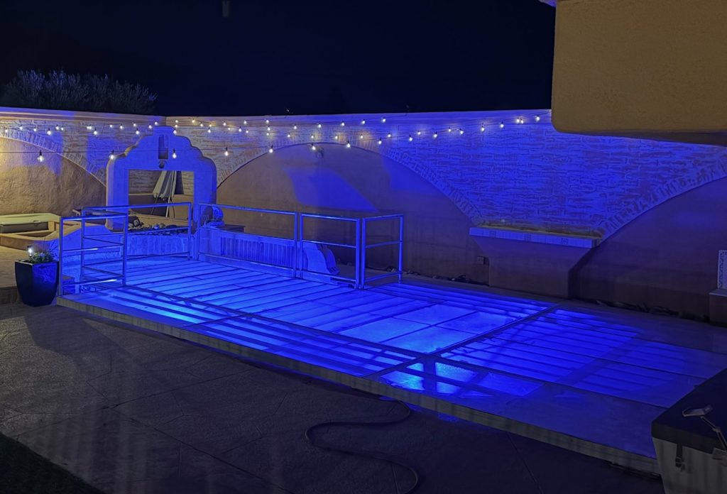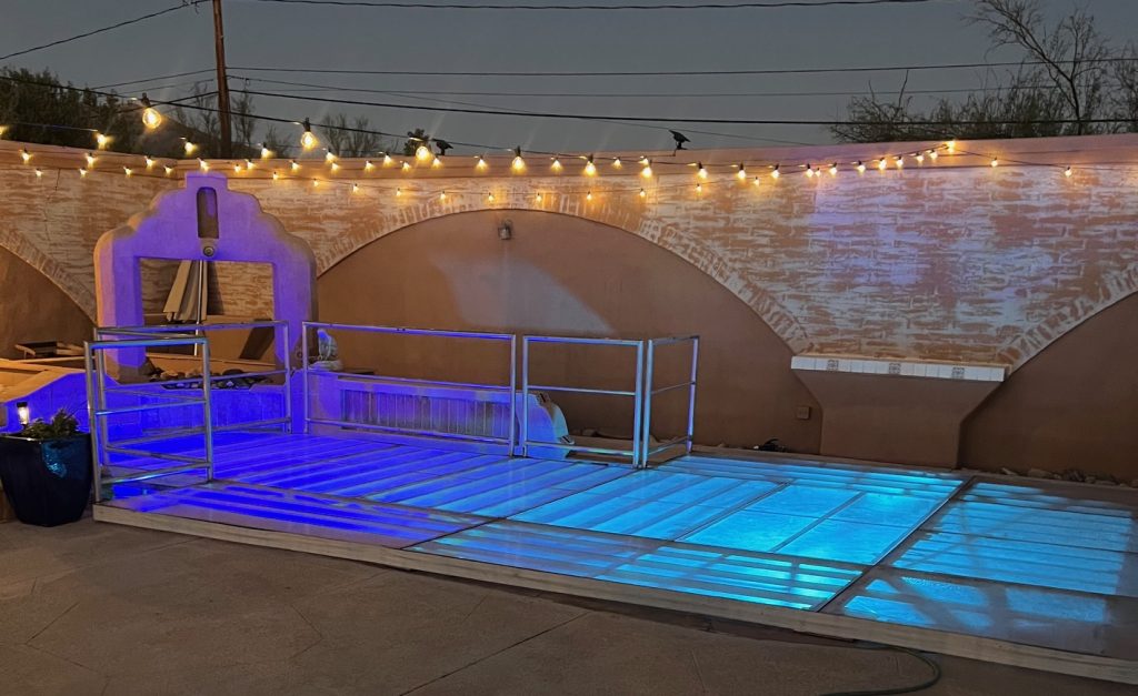 This pool cover job that Stage Commander precisely executed in Tucson, Arizona, was built over a pool with an approx. size of 35×14 with one end of the pool containing a raised retaining wall. That challenge never stops Stage Commander. They built an odd shaped but mostly rectangle pool cover over the irregular shaped pool. In the end, the client ended up selecting plexiglass as the surface type and opted to have handrails on the open water side. The icing on the cake was adding Stage Commander’s in pool LED water fixture package.